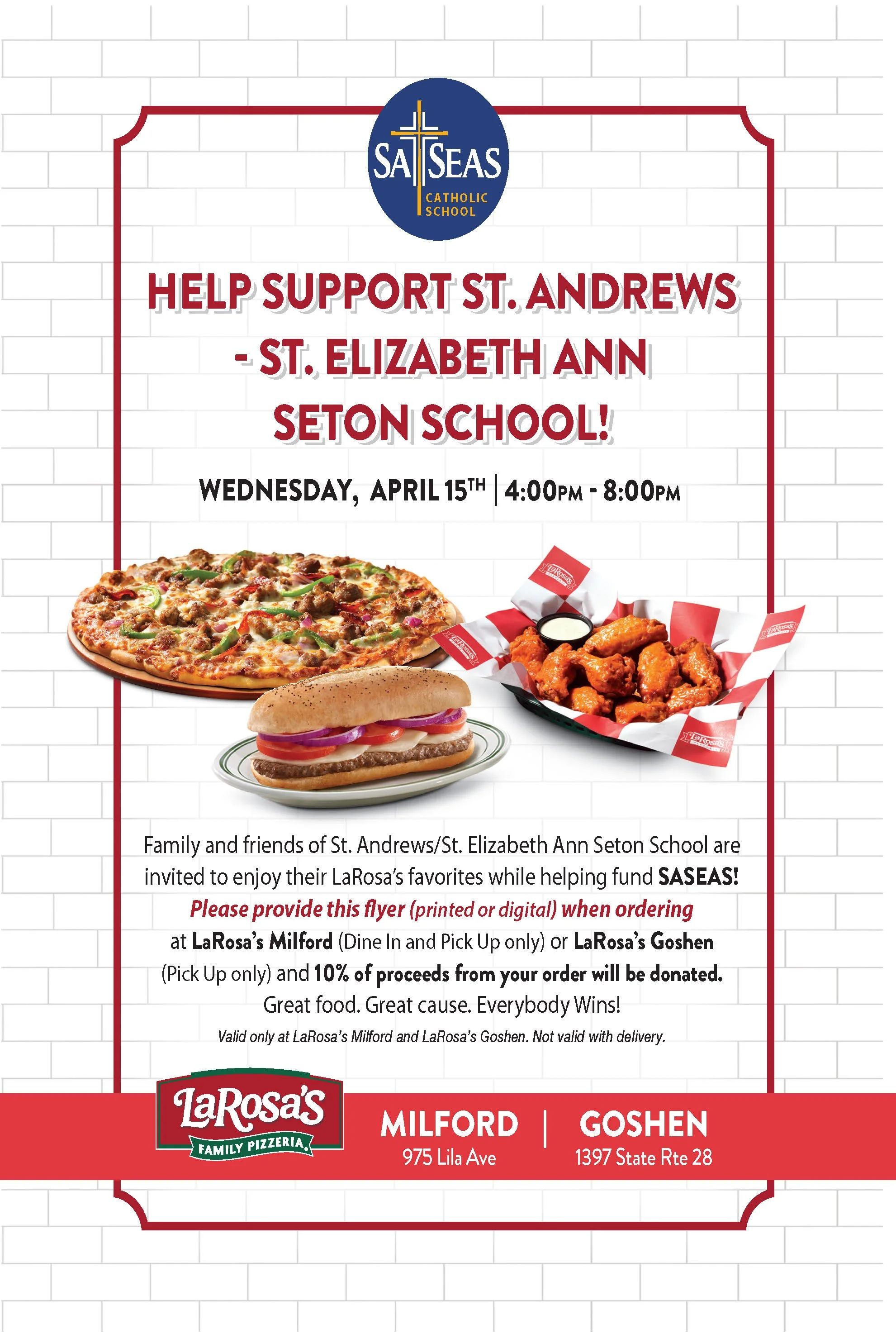 LaRosa's Dine To Donate Wednesday, April 15, 2026 4:00 PM 8:00 PM LaRosa's Milford OR Goshen (map) Google Calendar ICS Please provide the below flyer (printed or digital) when ordering at LaRosa’s Milford (dine in and pick up only) or LaRosa’s Goshen (pick up only) and 10% of proceeds from your order will be donated back to our school!